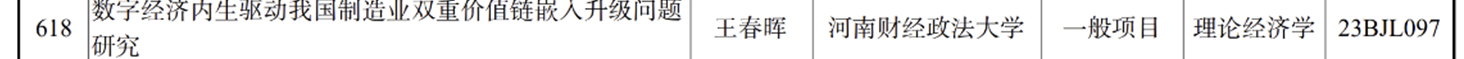 近日,根据全国哲学社会科学工作办公室《2023年国家社会科学基金年度项目和青年项目立项结果公布》的通知,由公司教师王春晖副教授团队主持申报的一般项目《数字经济内生驱动我国制造业双重价值链嵌入升级问题研究》获批立项。