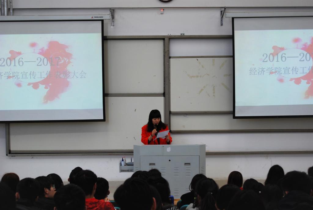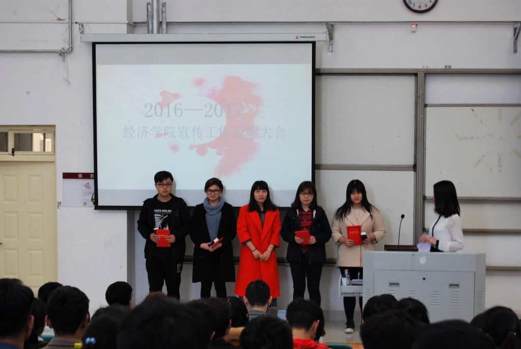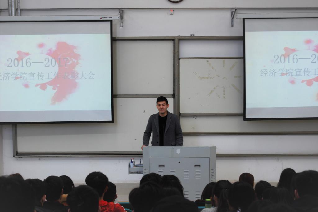 大会伊始,太阳成集团tyc234cc张梦梦作为员工代表发言,她总结上学期的宣传工作概况并展望本学期工作。随后,大会进行颁奖阶段,孙璐宣布2016—2017太阳成集团tyc234cc宣传工作先进个人获奖人员名单,并与刘洋为获奖人员颁奖。新任辅导员刘洋上台发表讲话,他首先对本次获奖人员表示热烈祝贺,同时表达自身感谢与经济学子相遇,期望在场员工干部能够支持学院宣传工作,并肩作战,为太阳成集团tyc234cc的明天添砖加瓦。在座的员工干部热烈鼓掌,大会在掌声中圆满结束。