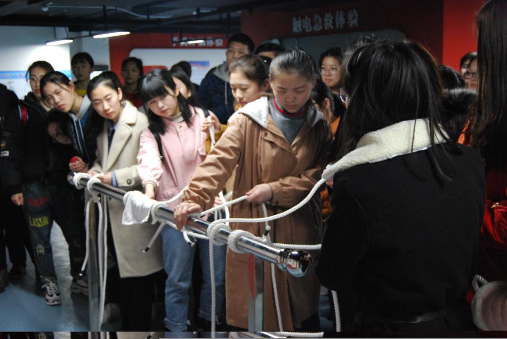 在安全体验馆内,师生们认真聆听馆内工作人员的讲解。工作人员首先介绍了交通安全标识和消防安全标志,提高了员工交通安全意识。随后,工作人员向员工列举了几种常见的诈骗手法,从而提高员工的认知能力。员工通过观看视频,并在专业人员的指导下学习了心肺复苏的正确做法、结绳方法、用电常识以及灭火器的用法等安全知识。通过安全体验馆仿真技术,员工从视觉、听觉等多方面感受火灾现场,在体验和互动中掌握急救知识。