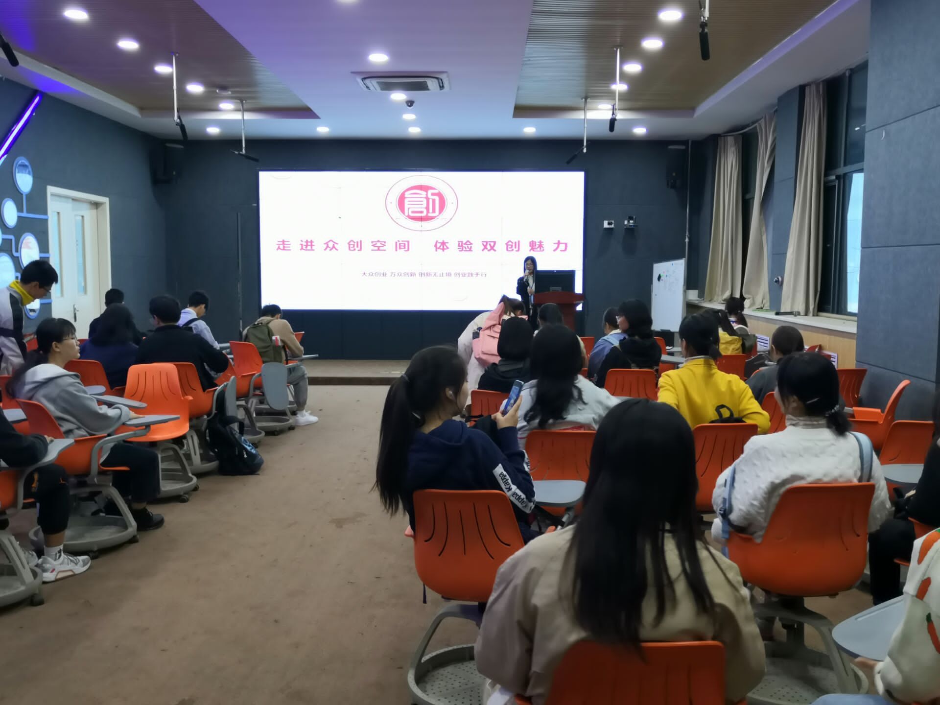 参观活动过程中,引导员为大家简单了解了目前入驻众创空间的大型项目,主要有优优祝福财大印象、松鼠家、慕光科技等等。最后,同学们聚集到众创空间的核心----路演厅,在这里,引导员向大家介绍了公司项目入驻的政策、条件和具体流程,鼓励同学们积极创新创业。