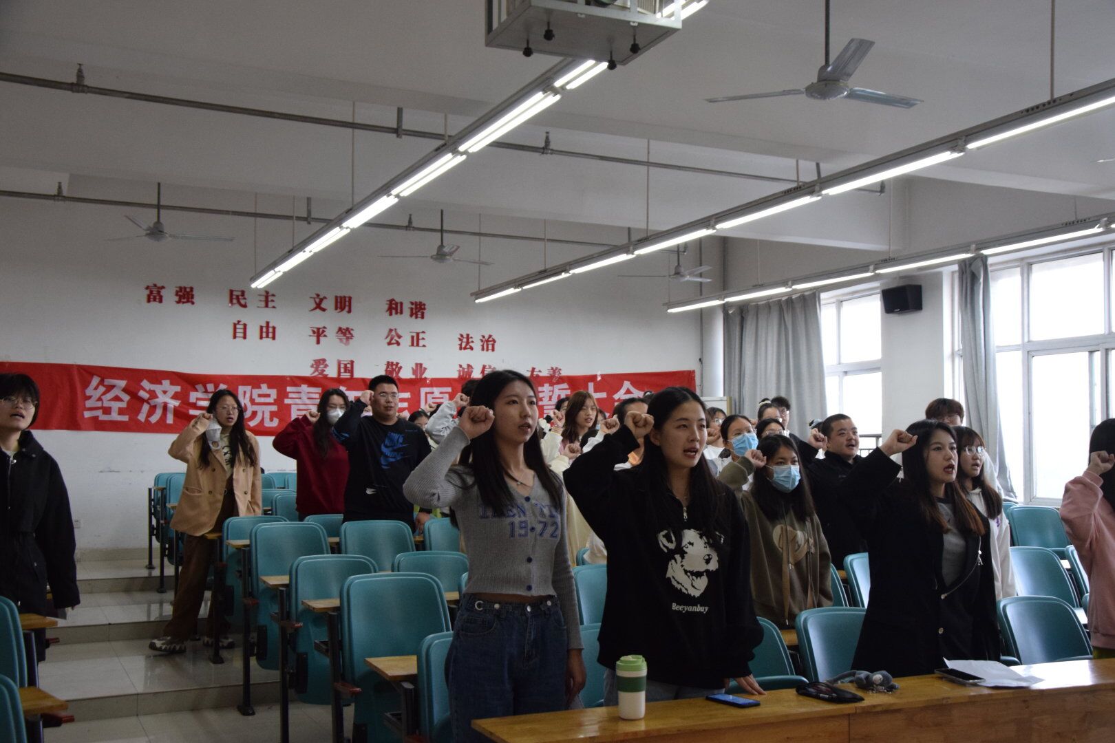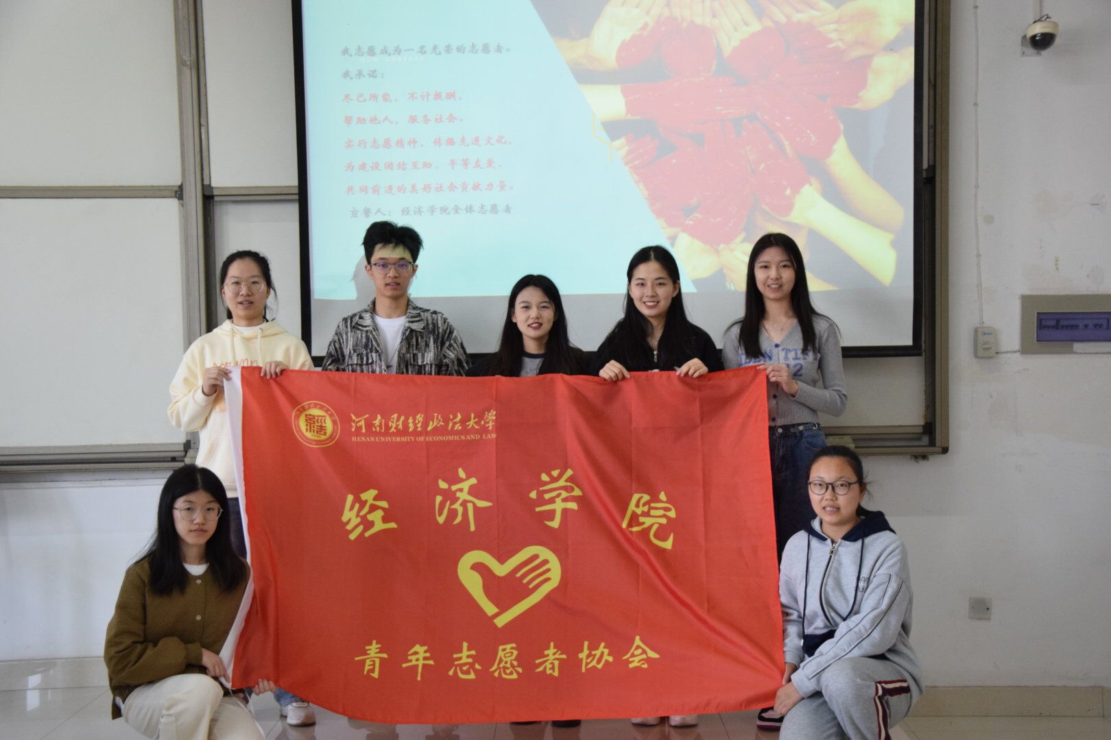 其次,同学们收听《青年志愿者之歌》,青协副部赵怡宁带领全体成员宣誓。