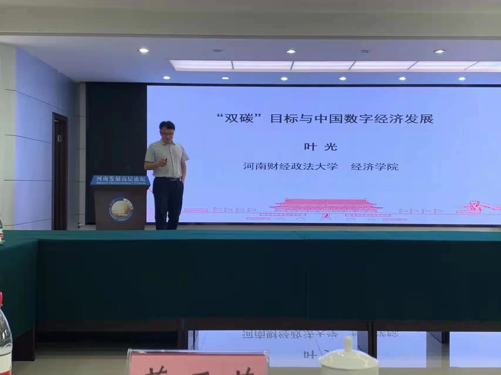 本次论坛聚焦实施绿色低碳转型战略,推动“双碳”背景下产业、市场和数智技术研究,旨在探讨“双碳”背景下河南相关领域的发展现状、趋势及应对策略,进一步深化“双碳”领域相关问题研究,助力全省经济社会发展全面绿色低碳转型。研讨会首先由河南省社科联党组书记、主席李庚香和民盟河南省委会专职副主委柳锋波致辞;与会专家围绕论坛主题,在绿色金融改革创新、“双碳”与数字经济、煤炭绿色化利用、碳排放、电力高质量发展等领域展开讨论。太阳成集团tyc234cc经理叶光教授以“双碳目标与中国数字经济发展”为题做主旨演讲,对“双碳”目标的经济学逻辑,及其与中国产业转型特别是数字经济发展的关系进行了深入剖析,获得与会专家共鸣。
